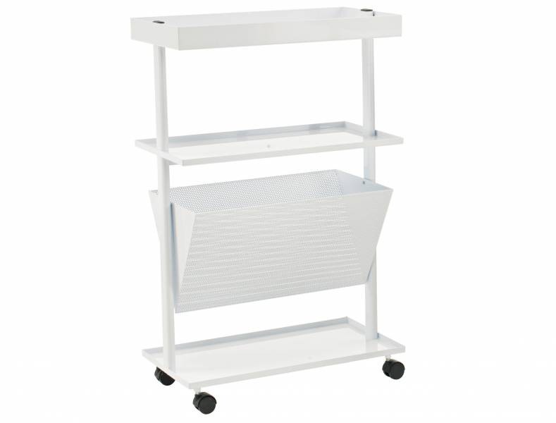 Carrello in metallo verniciato di bianco, con tre piani d'appoggio e cesta porta tutto.