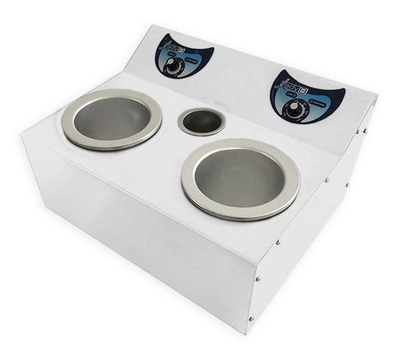 E' uno strumento semplice con doppio timer per il controllo analogico della temperatura. Ideale per cera a caldo da usare con gli appositi pentolini. Con vaschetta portaspatole al centro.