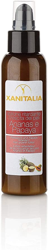 Lozione ritardante la ricrescita dei peli con estratto di ananas e papaya. Utilizzare dopo depilazione e nei giorni seguenti la depilazione, allunga la durata della depilazione, ritarda la crescita del bulbo pilifero.