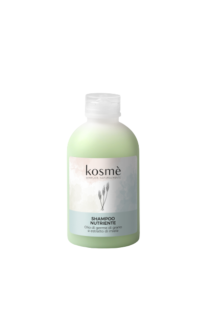 LO SHAMPOO NUTRIENTE KOSME' CON OLIO DI GERME DI GRANO ED ESTRATTO DI MIELE E' FORMULATO CON MODERNI TENSIOATTIVI E' IN GRADO DI DETERGERE E NUTRIRE DELICATAMENTE ED IN PROFONDITA' IL CAPELLO.